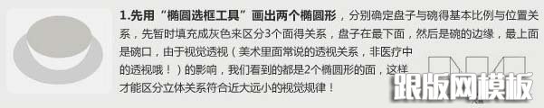 最终效果1、新建一个大小自定的文件,选择“椭圆选框工具”画出两个圆形,分别确定盘子与碗的基本比例与位置关系,先暂时填充灰色来区分3个面,盘子在最下面,然后是碗的边缘,最上面是碗口,由于视觉透视的影响,我们看到的都是2个椭圆的面,这样才能区分...