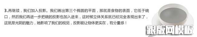 3、再继续,我们加入投影,我们画出第三个椭圆的平面,那就是实物的表面,它低于碗口,然后我们再进一步把碗的投影也加进来,这是立体关系就已经完全表现出来了,这就是光阴的魅力,它影响了我们的视觉,投影能让物体更实在,有分量感。