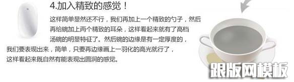 4、加入精致的感觉。这样简单显然还不行,我们再加上一个精致的勺子,然后再给碗加上两个精致的耳朵,这样看起来就有了高档汤碗的明显特征了。然后碗的边缘是有一定厚度的,我们要变现出来,简单,只要在边缘画上一羽化的高光就行了,这样看起来即自然又能表现出圆润的感觉。