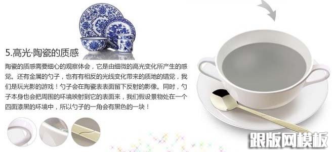 5、陶瓷的质感需要细心的观察体会,它是有细微的高光变化所产生的感觉。还有金属的勺子,也有相反光线变化带来的质地错觉,我们是玩光影的游戏,勺子会在陶瓷表面留下反射的影像。同时,勺子本身也会把周围的环境映射到它的表面来,我们假设景物处在一个四面漆黑的环境中,所以勺子的一角会有黑色的一块。