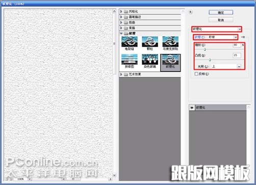 2、新建了文档后,执行菜单:“滤镜”/“滤镜库”,弹出滤镜库窗口,选择“纹理化”,纹理的样式选择“砂岩”,缩放为:80%,凸现为:15,光照选择:上,如图2所示。