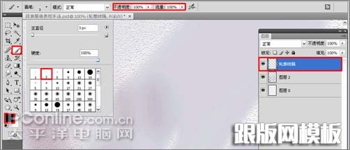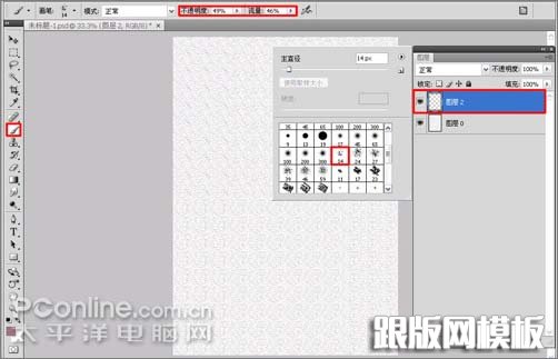 3、单击图层面板下方的新建图层按钮,新建一个“图层2”(快捷键Ctrl+Shift+N),选中“图层2”选择工具箱中的画笔工具,在文档中点击右键弹出笔尖设置对话框,选择“喷溅 14 像素”笔尖,在工具选项栏中设置不透明度为:49%,流量为:46%,如图3所示。