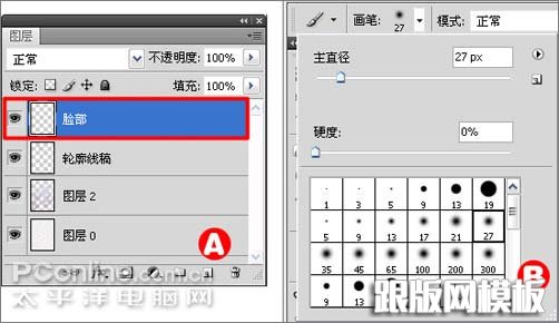 7、鼠标单击图层面板下方的新建图层按钮新建一个图层(快捷键Ctrl+Shift+N),并命名为“脸部”,如图7中A处所示;然后选择工具箱中的画笔工具,把笔尖设置为柔角像素的画笔,如图7中B处所示;至于大小没有限制,可结合左右中括号键来进行调整。