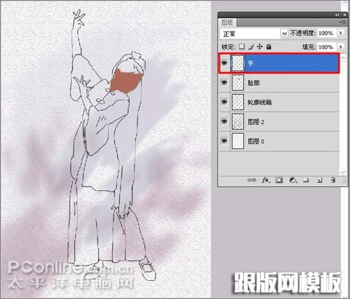 8、在选择“脸部”图层的状态下,在脸部的位置涂抹出脸的颜色,脸部RGB值为:#ab6b58;再新建一个图层并命名为“手”,如图8所示。
