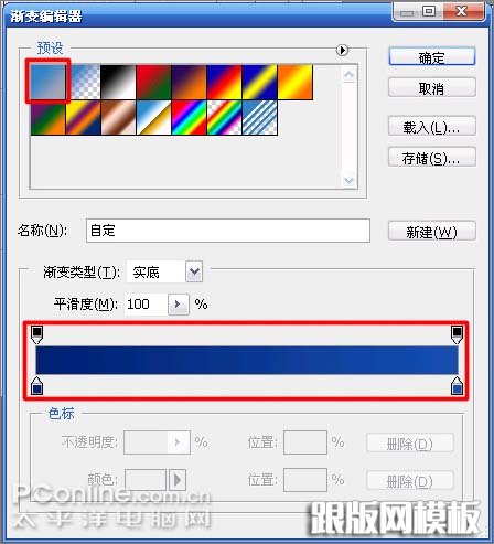10、弹出“渐变编辑器”,选择其中的“前景色到背景色渐变”,再设置其渐变颜色,如图10所示。