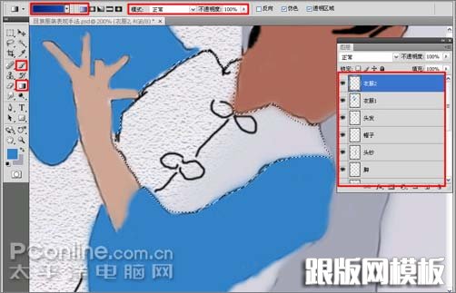 9、根据人物与服装的颜色与部分划分,给每个部分新建一个图层,以方便添加颜色与修改等操作,设置各部分的颜色,利用画笔工具画出各部分的颜色;如图9中,就分别新建有:“脸部”(RGB值:#ab6b58)、“手”(RGB值:#c8a594)、“脚”(RGB值:#a27f7e)、“头纱”(RGB值:#a1a4b6)、“帽子”(RGB值:#3074af)、“头发”(黑色)、“衣服1”(RGB值:#3380c4)、“衣服2”等图层;在“衣服2”的处理上,利用钢笔工具,勾勒出“衣服2”的位置,转换为选区后,然后选择工具箱中的渐变工具,在工具选项栏上选择渐变类型为线性,再单击渐变编辑器,如图9所示。