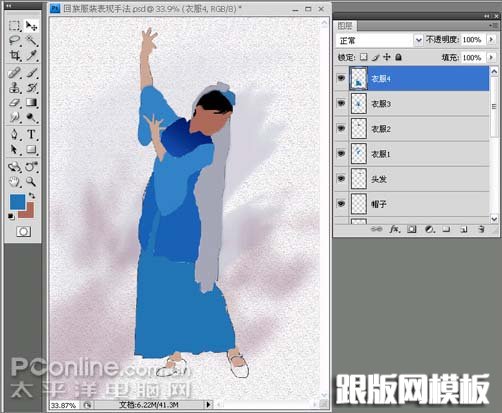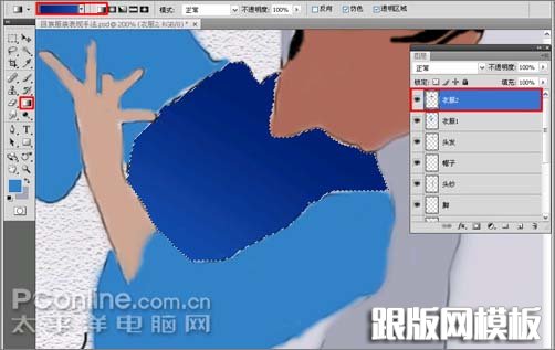 12、再新建“衣服3”与“衣服4”图层,利用钢笔工具勾勒出其轮廓,再转换为选区,然后在设置好前景色的状态下,按Alt+Delete组合键填充其颜色的方式进行填色,“衣服3”的RGB值为:#1862b5,“衣服4”RGB值为:#2674b6,填充后如图12所示。