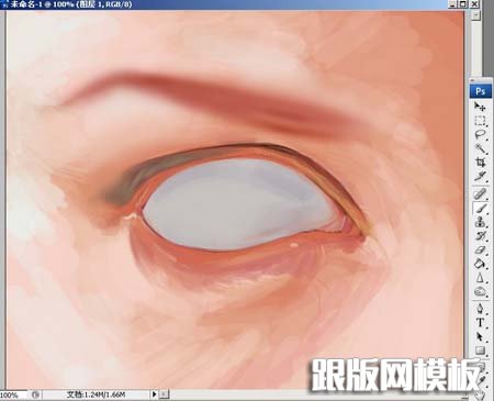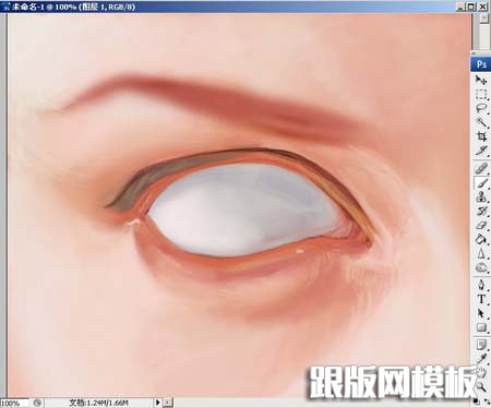 4、这里将笔刷更换为硬度为0%的普通笔刷。吸取想对应的颜色来柔化皮肤。因为下眼睑后期是要有些皱纹的,所以我在眼角部位保留了笔触。