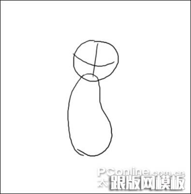 3、画卡通小动物的方法基本相同,先画大形再画细部。这里先画出圆形的头和豆子形状的身体,脸部用十字表示朝向。
