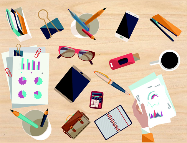 :笔记本,台式机,文件袋,夹子,笔筒,手机,订书机,文件,眼睛,U盘,咖啡,平板,计算器,圆珠笔,记事本,三角尺,钥匙,曲别针,铅笔,烟灰缸等商务办公桌面工具扁平化矢量ppt素材下载,可分离,可修改,第一期。