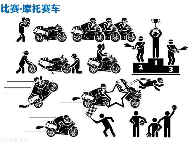 :模特赛车,摩托车比赛,摩托车赛颁奖台,摩托车赛车手,赛车,跑车维修,上班族过红绿灯,交通工具交通场景剪影ppt素材。