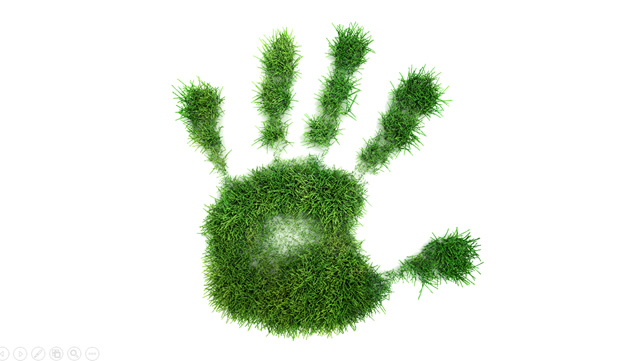 :掌心里的绿色地球,地球上的草地、树木、高楼,一圈草皮树木,绿色家园环保主题ppt素材。