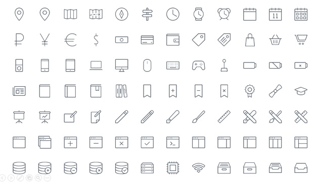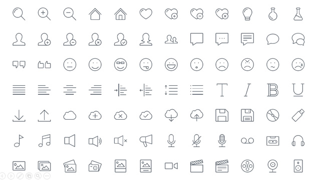 :线性图标,加减乘除符号,大于小于符号,全屏关闭全屏符号,音乐播放器按钮图标,垃圾桶,小旗子,放大镜,小房子,爱心,人物,对话气泡,表情线性图标,编辑器常用图标,云图标,影视娱乐元素图标,系统文件图标,运动系列线性图标,天气图标,餐饮线性图标,500+可修改颜色的线性图标打包下载。