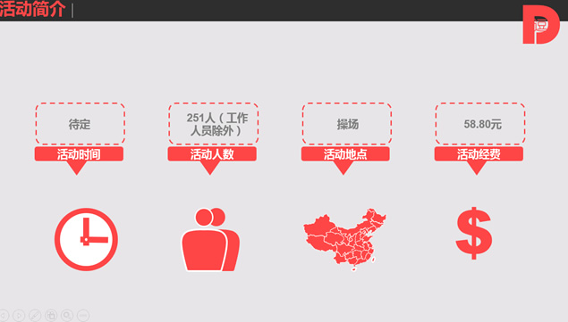 简介:活动主题,活动简介,活动内容,游戏介绍,注意事项,活动经费,新生第一次拓展活动介绍说明ppt模板。标签:拓展活动,活动介绍,新生。