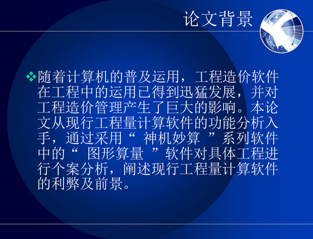 :随着计算机的普及运用,工程造价软件在工程中的运用已得到迅猛发展,并对工程造价管理产生了巨大的影响。本论文从现行工程量计算软件的功能分析入手,通过采用“ 神机妙算 ”系列软件中的“ 图形算量 ”软件对具体工程进行个案分析,阐述现行工程量计算软件的利弊及前景,图形算量软件应用对比研究课题,建筑科学与工程学院本科生论文设计答辩ppt模板。