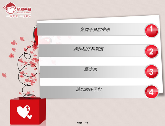 :一顿午餐,一份爱心,免费午餐,因爱而生,免费午餐志愿者团队,免费午餐筹款宣讲公益ppt模板。