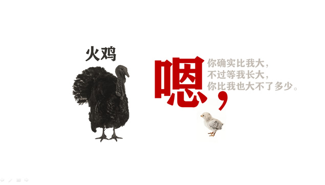:嘿,你没比我大多少,过不了多少天,我肯定会超过你!你确实比我大,不过等我长大,你比我也大不了多少,联想创始人柳传志的火鸡理论ppt模板。